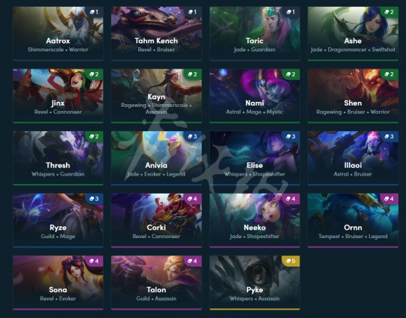 艾尼維亞,奧恩,塔姆,金克絲,庫奇,娑娜,黑默丁格,崔斯塔娜,璐璐,亞托克斯,艾希,伊莉絲,俄洛伊,凱隱,娜美,妮蔻,派克,瑞茲,慎,斯維因,泰隆,塔里克,錘石。