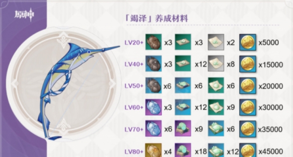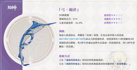 竭澤是釣魚獲取,不需要消耗原胚這類稀有材料,成本較低,有興趣人人都可以搞一把。竭澤的性能較為一般,主要是充能詞條對一些角色有用,但有西風基本輪不到竭澤。養成優先順序不高。