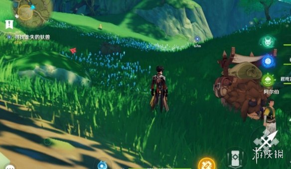 第一隻馱獸沿著水潭,走到下圖箭頭所指位置,會看到幾隻丘丘人圍著馱獸,處理掉丘丘人,安撫馱獸後自動回到阿爾伯身邊。