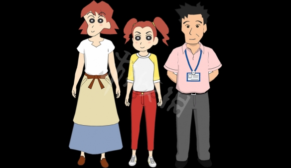 左邊起父親廣志、母親美伢、主角小新、妹妹小葵、愛犬小白,在本作中需要前往熊本的阿素小鎮拜訪朋友代代子。