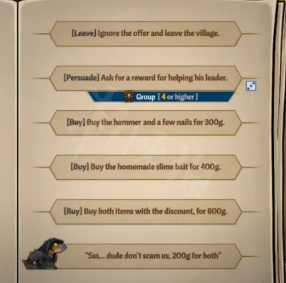 黏黏:第二層選擇綠區,前往蜥蜴人部落選擇購買600塊兩樣都買,然後前往地圖下方蜘蛛洞,在洞內前往劇毒之河觸發橋上的史萊姆事件,選擇拋出誘餌。