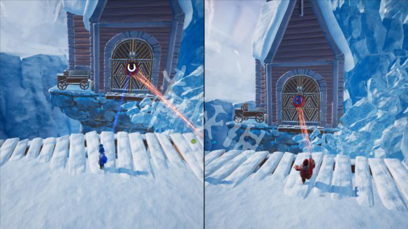 2.劇情結束後就是兩人的滑雪之旅,非常爽,到達下圖位置遇到一個難點,首先小梅把冰雕拉出來。拉到下圖位置後,科迪利用紅色磁鐵反彈到冰雕上。