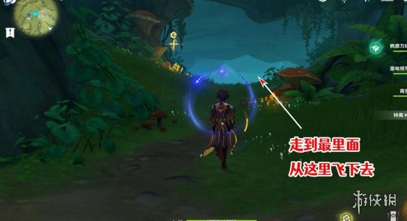 一路往裡走,可以看到一個較大的洞口,我們從這個洞口飛下去即可。