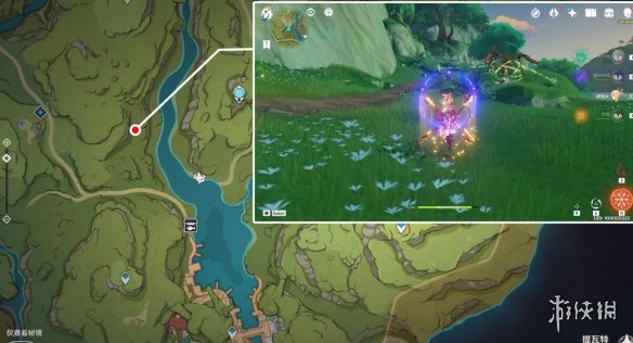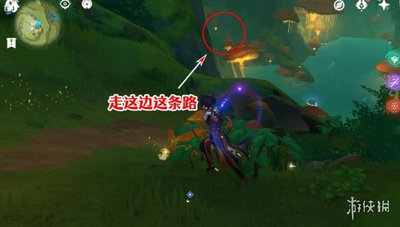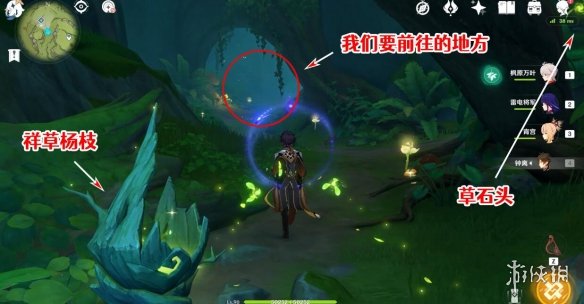 完成挑戰,解除屏障後,我們進入屏障之前擋著的地方,面前的草種子是用來打破右邊的草石頭,解鎖右邊的通路的,這裡可以順便解鎖一下,但我們不要右轉,往我紅圈圈起來的地方走。
