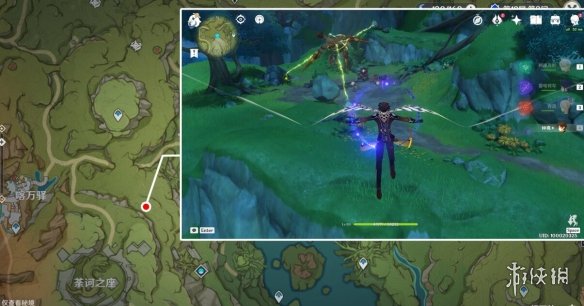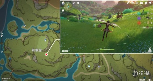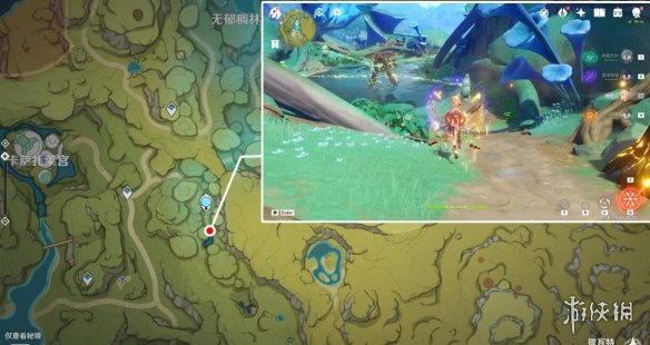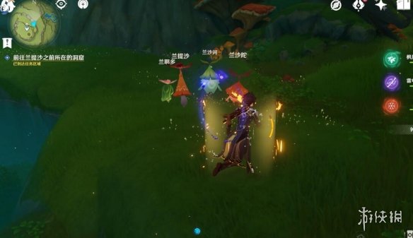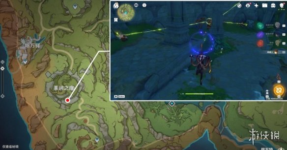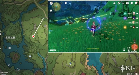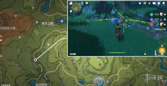 註:這裡之前是一片死域,洞口的位置剛好就是死域瘤在的地方,而且被草石頭擋著,需要拾取草種子後使用重擊或弓箭角色的瞄準攻擊擊打草石頭,通過草種子的協同攻擊將草石頭破壞,就會露出洞口。