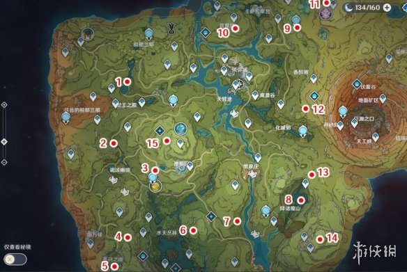 註:之所以是15處,是因為觸發任務時的那一處也包括在內,加起來就是16處。其中1~11都在地上,非常好找;12~15則位於山洞裡,注意不要遺漏。