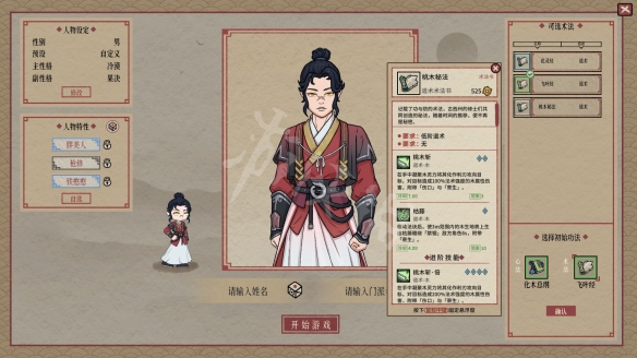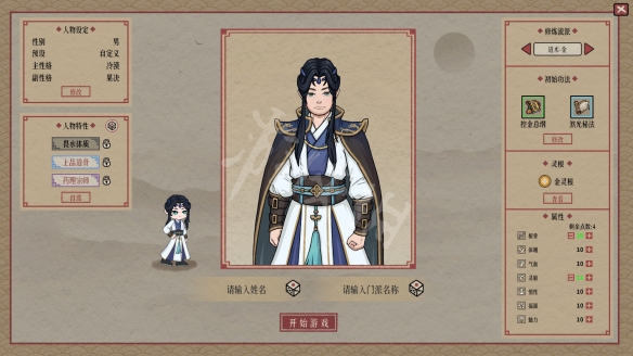 現階段,遊戲提供了劍修、商賈、善人、大盜四個模板。相比自定義人物,預制角色有以下區別: