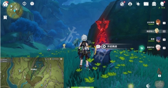 我們來到降諸魔山西南方向的點,我們會看到一個限時挑戰,我們需要在100秒之內收集8個草之微粒(可以利用四葉印)