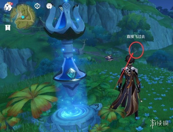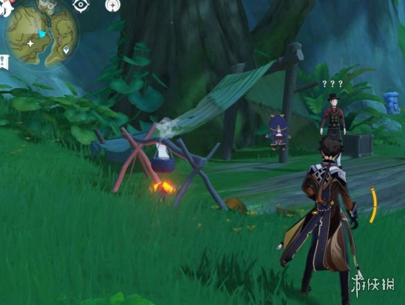 來到傳送點後,朝著地圖西北方向看,你就會發現在大樹底下有一個小營地,飛過去。