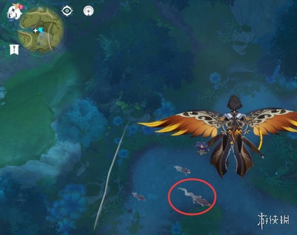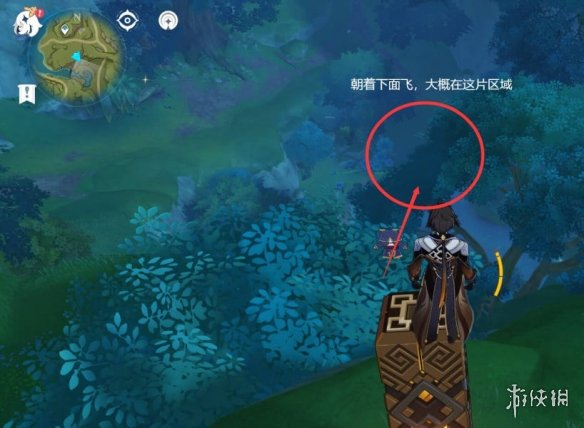 來到坡這裡,繼續朝著地圖東南方向看。第一個兇猛動物就在這我畫的地方。飛過面前的樹,降點高度就能看見了。