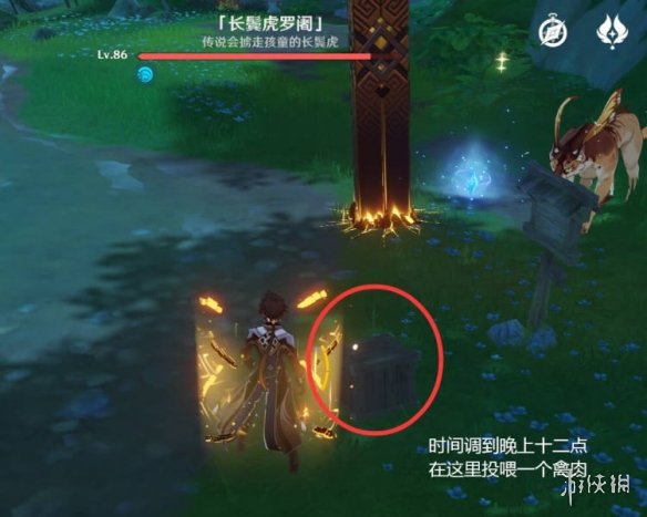 來到告示牌面前有個木箱子,在木箱子上面投喂一個禽肉,然後把時間調到晚上十二點,第二隻兇猛動物就出現了。
