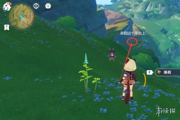 繞過山之後,右手邊有一朵薄荷,站在薄荷的位置朝著地圖東南方向看。在那個巨大斜坡的右邊有個平台,往那裡走。