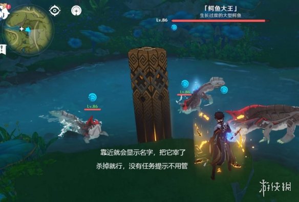 把高度降低就能發現在水池旁邊有一隻很胖的鱷魚,靠近它就會顯示名字。把它宰了就好,沒有任務提示不用管。