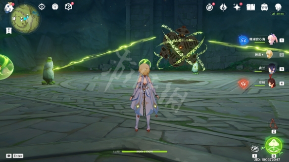 5,用火元素角色(安柏)攻擊石鎖,解除封印,再擊敗小寶