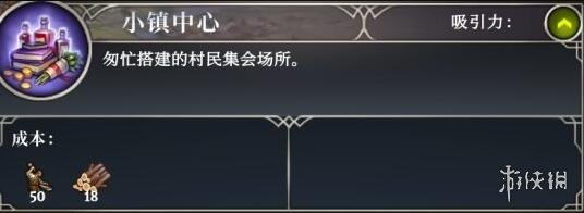 初始建築,能夠通過點擊查看整個營地的各項基礎信息,在強盜入侵時能夠通過建築頂上出現的鐘讓附近的村民駐紮並對周邊範圍進行防禦,在滿足條件後能夠通過升級小鎮中心解鎖新的建築。
