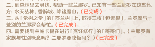 1、需要完成森林的孩子們世界任務,我們需要完成森林書道具中以下部分(圖中每段話後面跟著已完成字樣)。