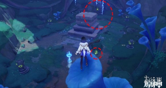 2. 解謎開啟「傘蓋的蔭蔽」秘境,首先我們需要獲取“草種子”並重擊下圖中大圓內的石頭。