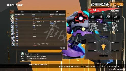 擴張零件擁有包含「正面效果」及「負面效果」在內的多種效果。玩家可針對較弱的能力值進行強化,並進一步凸顯機體所擁有的特徵。(目前試玩版只能用一個擴張零件槽,個人猜測最多能裝四個擴張零件)