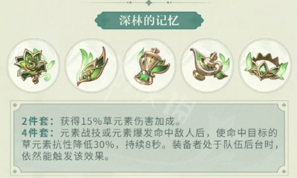1.簡介:2件套加15%草傷,4件套釋放技能降低敵人30%草抗,屬性非常標準的草套,作為草元素角色通用聖遺物套是沒問題的。