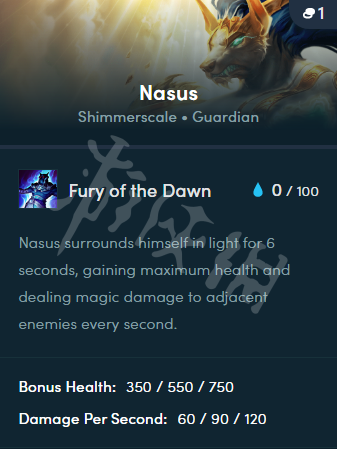內瑟斯令自己被光芒包圍,獲得350/550/750最大生命值,持續6秒,期間會每秒對周圍的敵人造成60/90/120魔法傷害。
