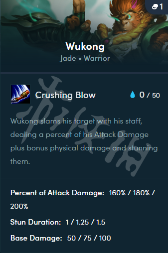 悟空向目標揮擊,造成物理傷害(160/180/200%攻擊力+50/75/100)並暈眩其1/1.25/1.5秒。