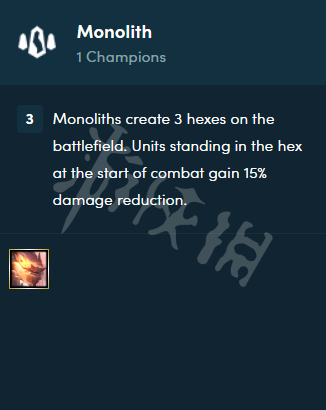 (1) [巨岩龍]在戰場上生成3個[巨岩格]。站在[巨岩格]上的弈子們會在戰斗開始時獲得15%傷害減免。