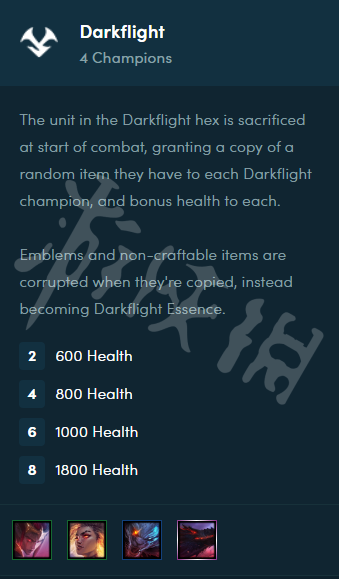 [黯靈格]上的弈子會在戰斗開始時被獻祭,將其攜帶的隨機一件裝備的復製品提供給每個[黯靈龍]英雄,以及額外生命值。