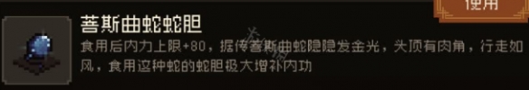 游戲中的大蛇被玩家擊敗後可以獲得菩斯曲蛇蛇膽,蛇膽的作用是食用後內力的上限增加80。據傳菩斯曲蛇隱隱發光,頭頂有肉角,行走如風,食用該蛇膽可以極大補增內功。