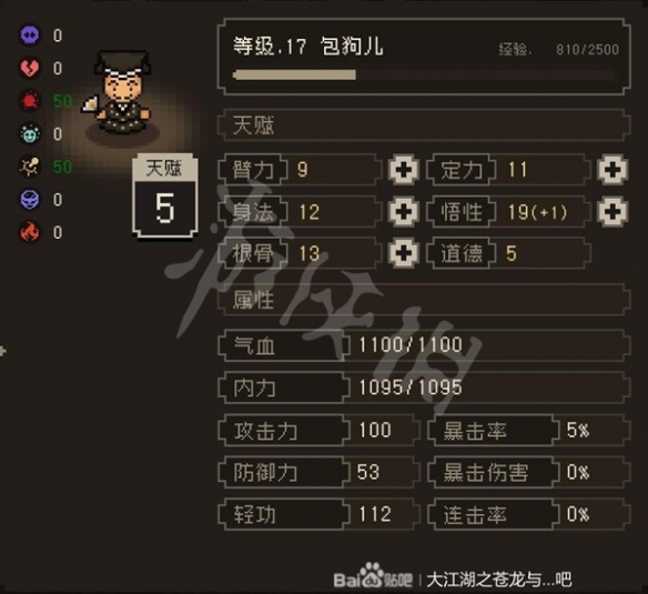 5.悟性高,根骨不錯,可以快速學習很多技能。定力太低,我給加了好多。我把儒家系的內功都讓他學了,可以給自己回血,解debuff