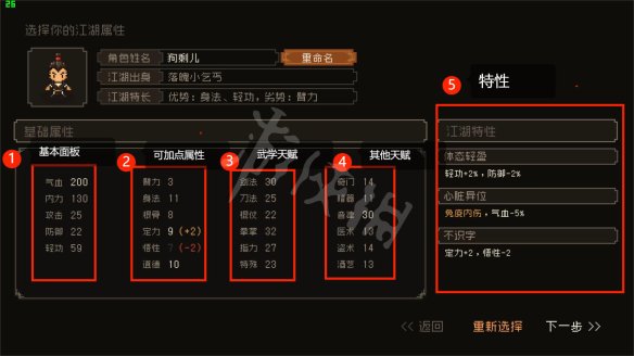 大江湖蒼龍與白鳥在遊戲初始有讓你先選擇江湖的屬性,在這個屬性面板中有各種類的選項,比如可加點屬性、武學天賦、特性等選項,有些玩家不知道該怎麼選,這里給大家帶來了大江湖蒼龍與白鳥屬性面板基礎選項一覽,一起來看下吧。