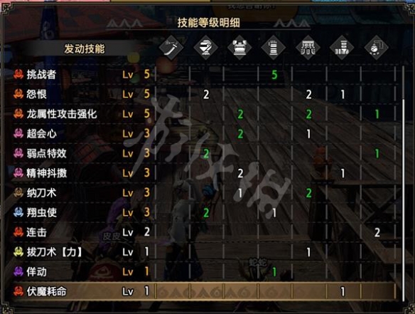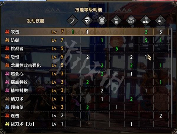 然後根據武器的不同,還有一點點區別。由於我所使用的武器中,泥翁太和鬼神斬破刀(水和雷屬性)多一個一級孔,所以水和雷屬性太刀配裝最後會多出一級拔刀術力,少一級佯動。