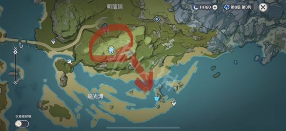 先傳送到神像,然後再地圖下方,有一座山頭,飛到這個位置。
