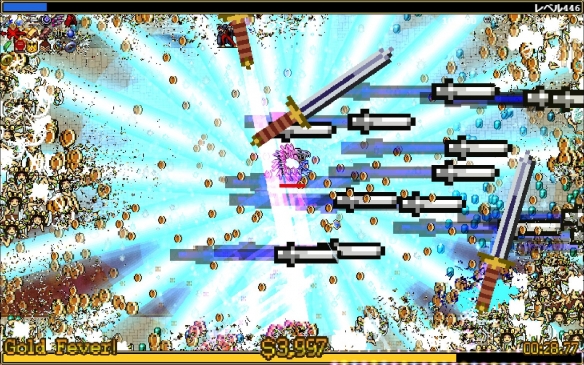 這里有一個需要注意的點,在淘金熱達到一萬以上時,大力移動很容易讓進度條斷掉。所以在撿經驗寶石尤其是寶箱時,要緩慢移動,輕點方向,靠怪物爆出的金幣和周圍的爆出來的錢袋,恢復進度條。
