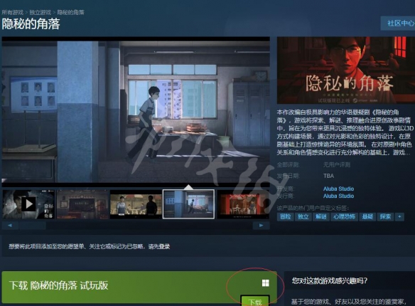 目前免費的試玩版本網友們可以在steam商店搜索【隱秘的角落】,進入相應頁面後就可以看到【下載隱秘的角落試玩版】的內容了具體如下圖: