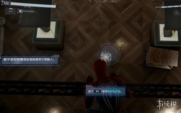 從房頂進入藝術館後,向敵人附近的地面或物體發射蜘蛛網,可以引開敵人。