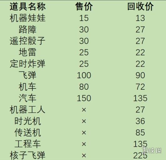 (×表示該道具無法在商店購買,只能通過研究所研發和售賣)