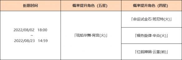 活動期間,四星角色「命運試金石·班尼特(火)」「燥熱旋律·辛焱(火)」「紅毹嬋娟·雲堇(岩)」的祈願獲取概率將大幅提升!