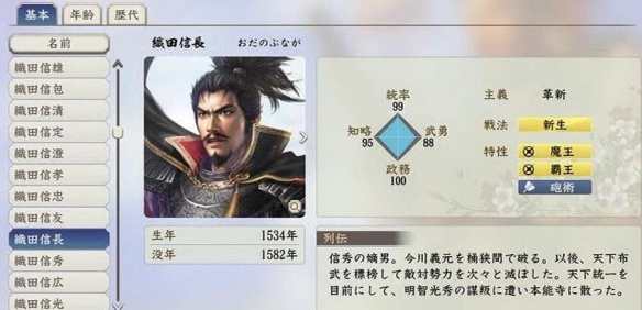 信長,魔王(部隊能力上升,估計是全能力小~中幅度上升)霸王(對郡瞬時壓制)炮術(部隊鐵炮lv上升?本代看著沒兵種區分了,估計要靠疊政策和特性體現兵種),戰法:新生(攻擊上升?)