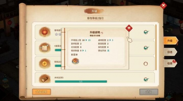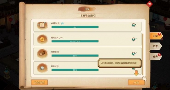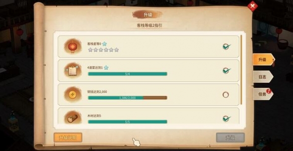 客棧到達星級、菜品數、資源數要求後就能升級,可以在指引中查看升級需求。