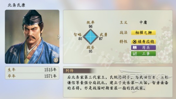 信長之野望新生是一款戰爭類策略遊戲,扮演戰國大名,可以給予功臣們領地,獲得領地的家臣會自行判斷如何發展城下町及領地,並在發生武裝沖突時率領軍隊出戰。下面小編就帶來信長之野望新生北條氏康武將立繪介紹,一起來看看吧。