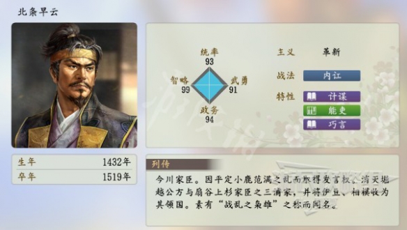 以上就是信長之野望新生北條早雲人物介紹的內容了,更多遊戲相關資訊攻略請關注,我們將會第一時間更新最全的內容幫助大家了解該遊戲,一起來看一下吧。