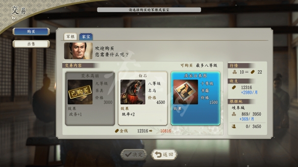 注意:若要購買高級家寶,需頒布政策“樂市樂座”。