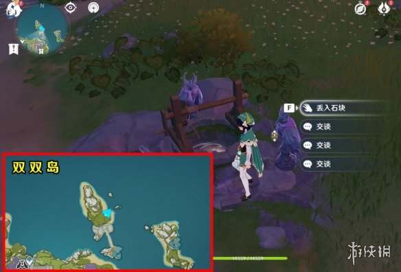 「錯位的海螺三」在雙雙島北面的小島嶼上,與三隻夜鴉對話,就會出現一個[丟入石塊]的選項。