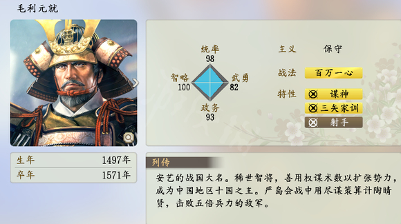 安藝的戰國大名。稀世智將,善用權謀術數以擴張勢力,成為中國地區十國之主。嚴島會戰中用盡謀策算計陶晴賢,擊敗五倍兵力的敵軍。