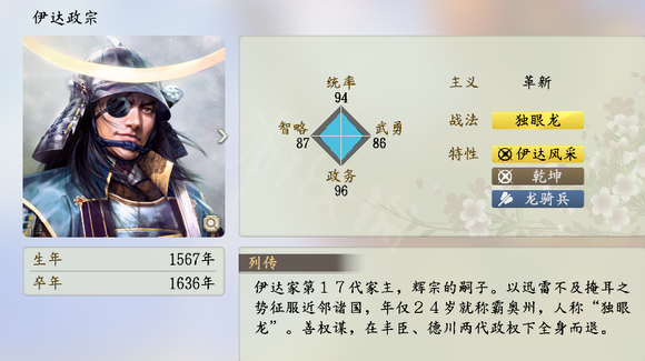 伊達家第17代家主,輝宗的嗣子。以迅雷不及掩耳之勢征服近鄰諸國,年僅24歲就稱霸奧州,人稱“獨眼龍”。善權謀,在豐臣、德川兩代政權下全身而退。