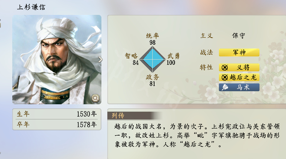 越後的戰國大名,為景的次子。上杉憲政讓與關東管領一職,故改姓上杉。高舉“毗”字軍旗馳騁於戰場的形象被敬為軍神。人稱“越後之龍”。