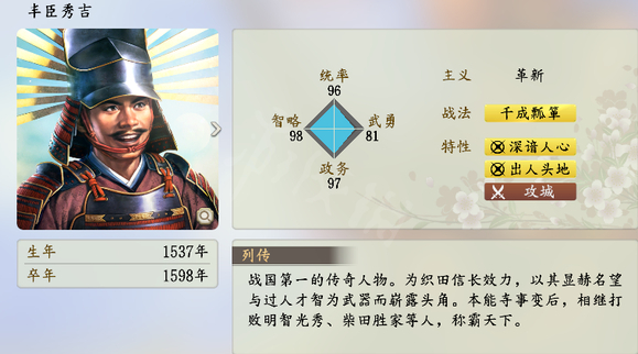 戰國第一的傳奇人物。為織田信長效力,以其顯赫名望與過人才智為武器而嶄露頭角。本能寺事變後,相繼打敗明智光秀、柴田勝家等人,稱霸天下。