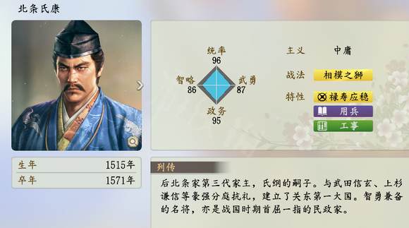後北條家第三代家主,氏綱的嗣子。與武田信玄、上杉謙信等豪強分庭抗禮,建立了關東第一大國。智勇兼備的名將,亦是戰國時期首屈一指的民政家。