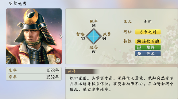 織田家臣。其學富才高,深得信長器重,孰知突然變節並在本能寺弒殺信長。事變後勸降不力,在山崎會戰中敗北,逃亡途中殞命。