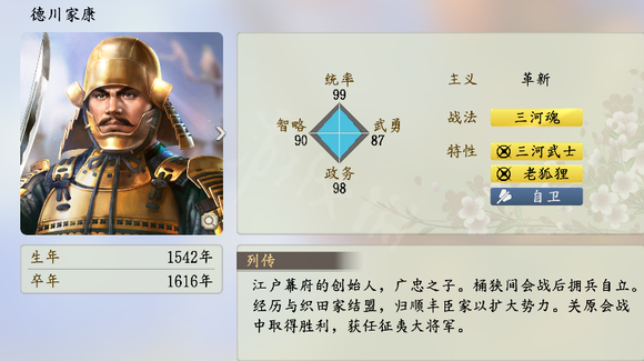 江戶幕府的創始人,廣忠之子。桶狹間會戰後擁兵自立。經歷與織田家結盟,歸順豐臣家以擴大勢力。關原會戰中取得勝利,獲任征夷大將軍。
